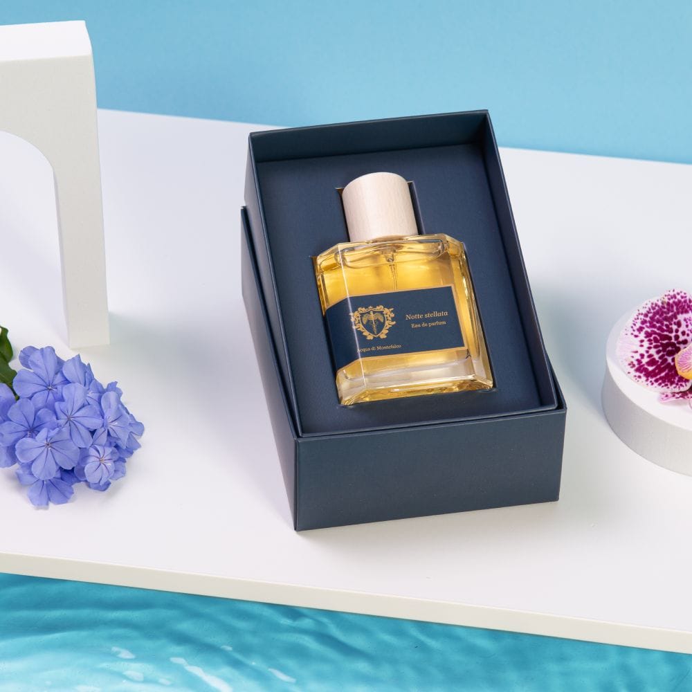 Immergiti nell’incanto di Notte Stellata, una fragranza che cattura l’essenza di una notte magica, dove il profumo della terra si mescola alla dolcezza dei fiori e alla profondità delle spezie